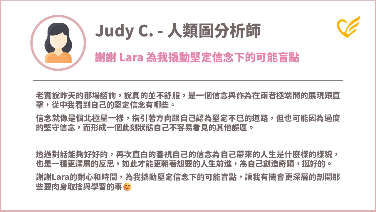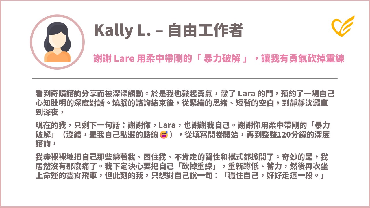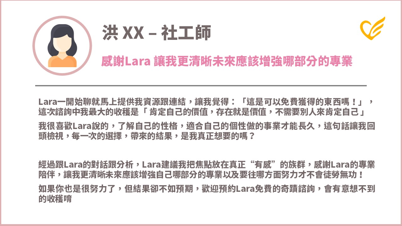 更重要的是,Lara 老師的傾聽與引導,讓我感到前所未有的安全感。她不只是提供方法,而是帶來了勇氣與價值,讓我重新相信自己可以突破困境。