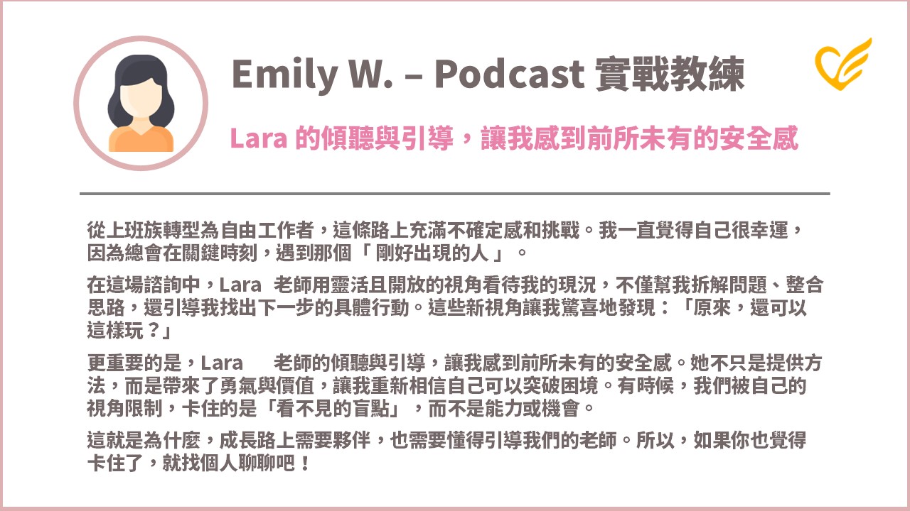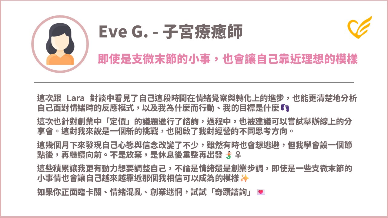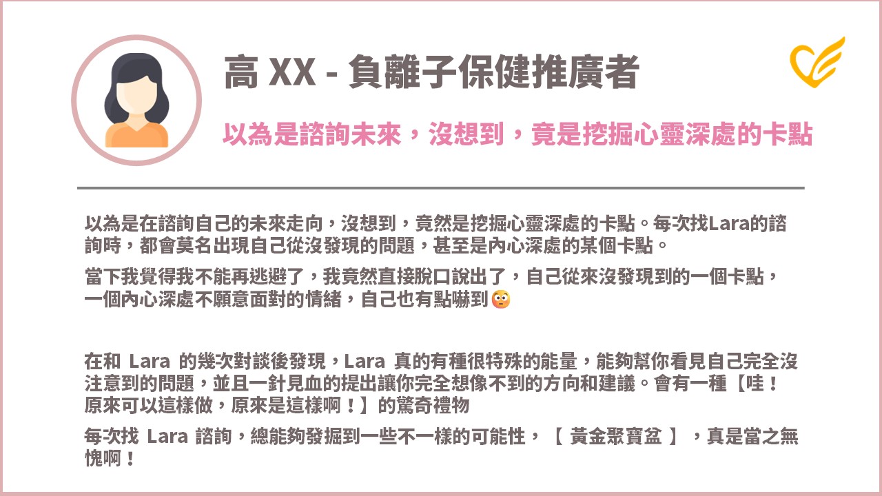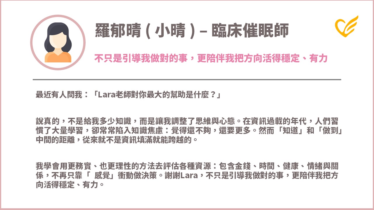 更重要的是,Lara 老師的傾聽與引導,讓我感到前所未有的安全感。她不只是提供方法,而是帶來了勇氣與價值,讓我重新相信自己可以突破困境。