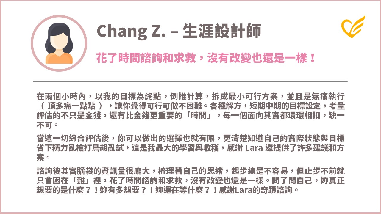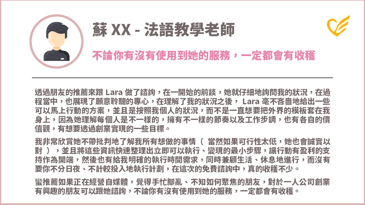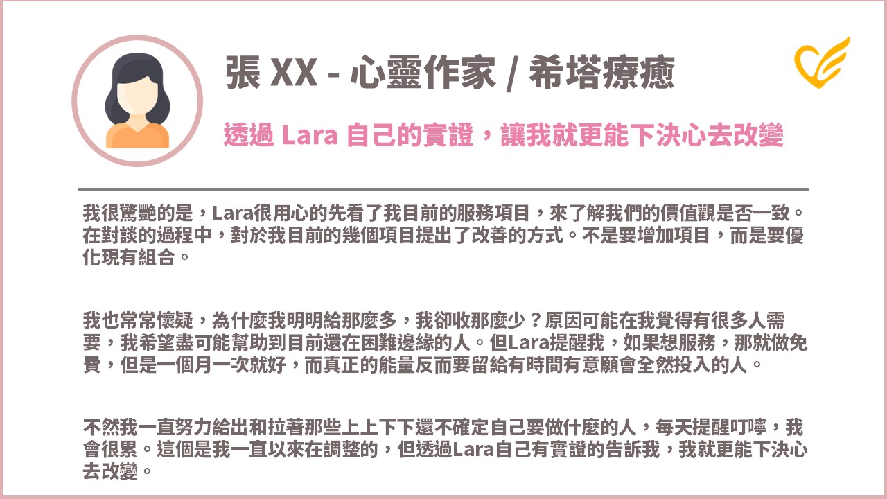 透過朋友的推薦來跟 Lara 做了諮詢,在一開始的前談,她就仔細地詢問我的狀況,在過程當中,也展現了願意聆聽的專心,在理解了我的狀況之後, Lara 毫不吝嗇地給出一些可以馬上行動的方案,並且是按照我個人的狀況,而不是一直想要把外界的模板套在我身上。