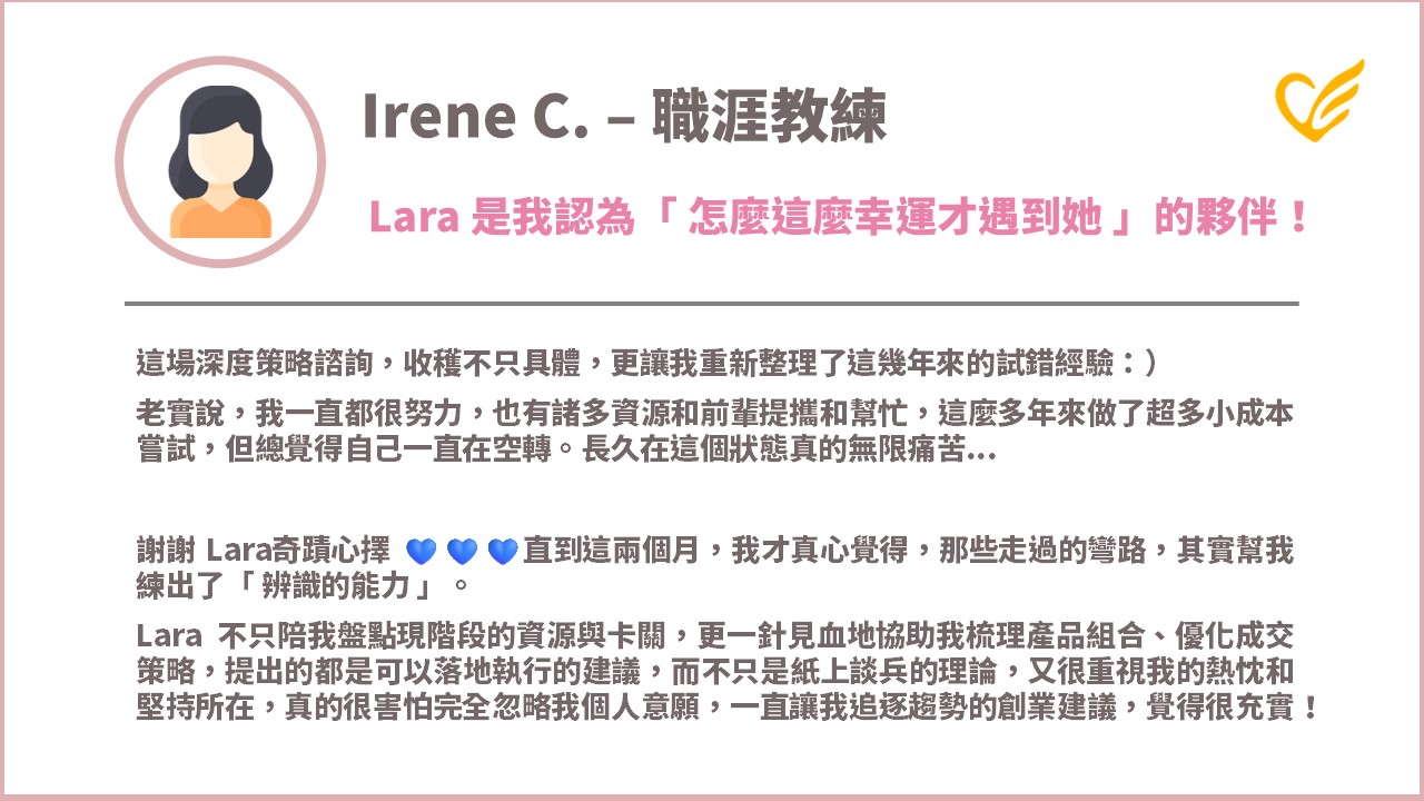 Lara 不只陪我盤點現階段的資源與卡關,更一針見血地協助我梳理產品組合、優化成交策略,提出的都是可以落地執行的建議,而不只是紙上談兵的理論,又很重視我的熱忱和堅持所在,真的很害怕完全忽略我個人意願,一直讓我追逐趨勢的創業建議,覺得很充實!
