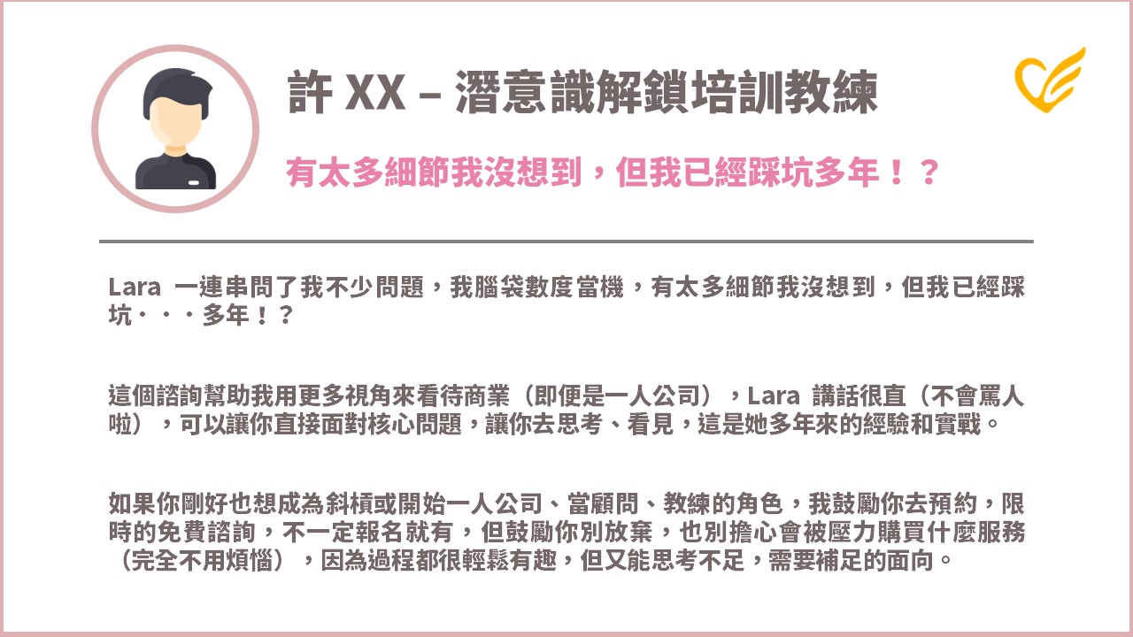 如果你剛好也想成為斜槓或開始一人公司、當顧問、教練的角色,我鼓勵你去預約,限時的免費諮詢,不一定報名就有,但鼓勵你別放棄,也別擔心會被壓力購買什麼服務(完全不用煩惱),因為過程都很輕鬆有趣,但又能思考不足,需要補足的面向。